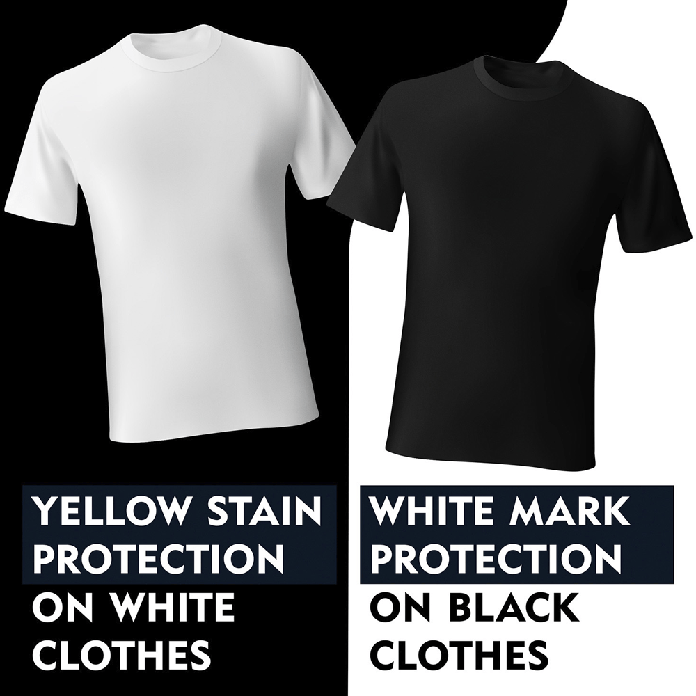- مصمم ليوفر حماية قوية تمنع ظهور علامات بيضاء على الأقمشة الداكنة وتقلل ظهور البقع الصفراء على الملابس الفاتحة.