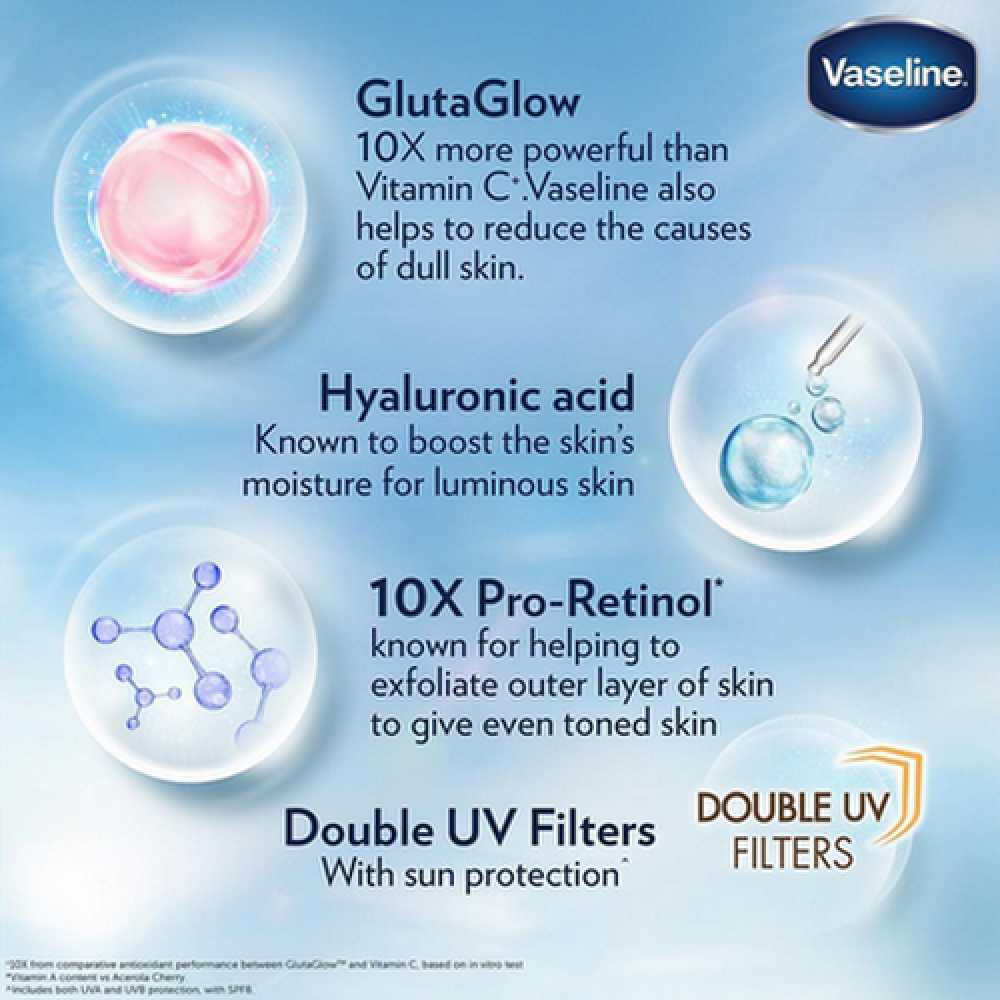 - يساعد على تحويل البشرة الباهتة والجافة ذات البقع الداكنة إلى بشرة ناعمة ومتجانسة اللون مع لوشن الجسم فازلين فائق الترطيب.