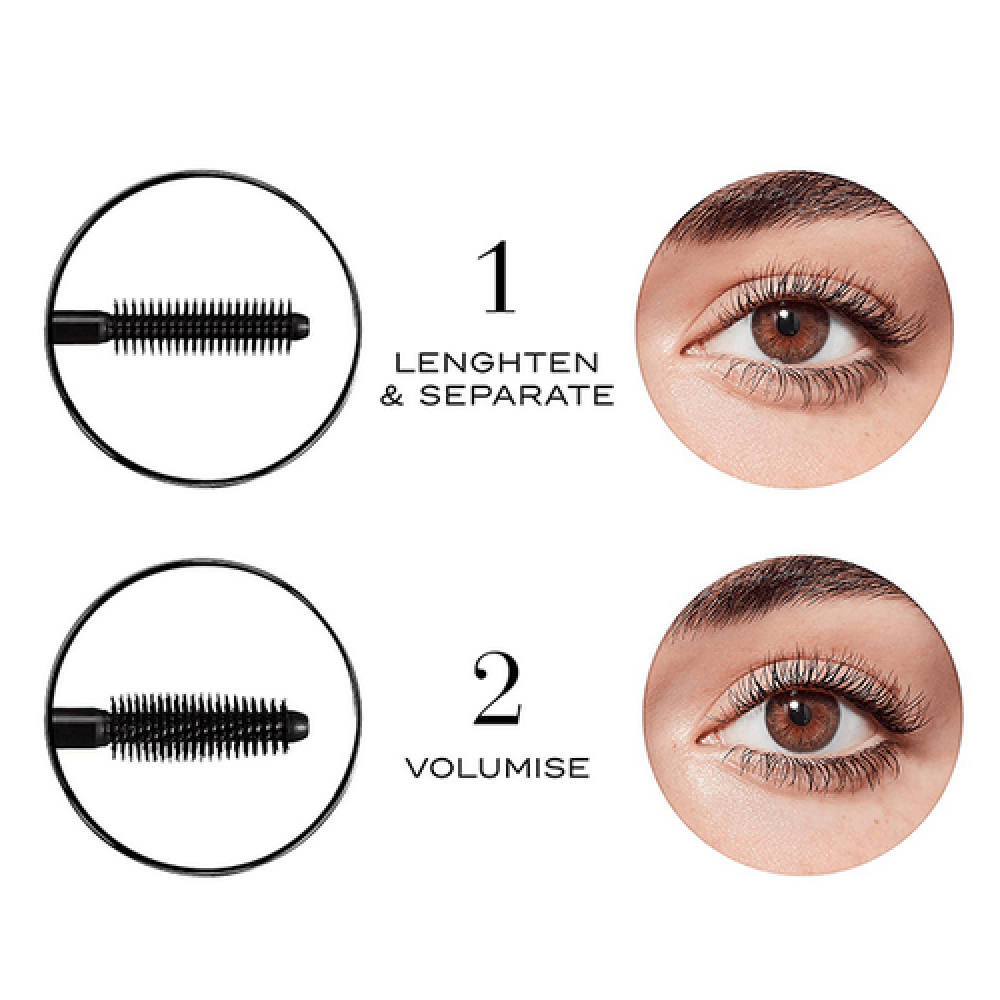 - مصممة لتمنحك مفعول فرشتين بفرشاة واحدة (تطيل الرموش وتفرّقها عن بعضها البعض وتكثفها بشكل ملحوظ بتمريرة واحدة).